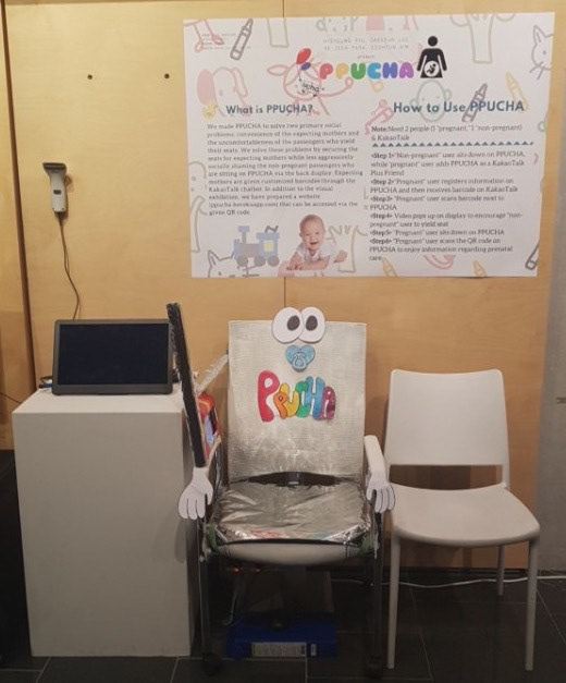 PPUCHA, or the Prenatal PUblic CHAir, was developed to help alleviate some of the struggles pregnant women face in the public sphere, particularly on subways. Many argue that the current priority seats are inefficient, as they prevent people from sitting down when there are no pregnant women on board. In order to address these concerns, the developers of PPUCHA set out to design a system that will allow non-pregnant users to sit down, while simultaneously inducing them to yield their seat when a pregnant woman boards the train. PPUCHA utilizes the KakaoTalk Chatbot/Plus Friend system and barcode scanners to ensure that expecting mothers will be able to sit. The media content that plays in the back will socially “shame” nonpregnant users to give up their seats when a pregnant user scans their codes. In addition, the development team of PPUCHA created a website which can be accessed via a QR code, to share information on healthcare, laws, and social benefits in place for expecting mothers.